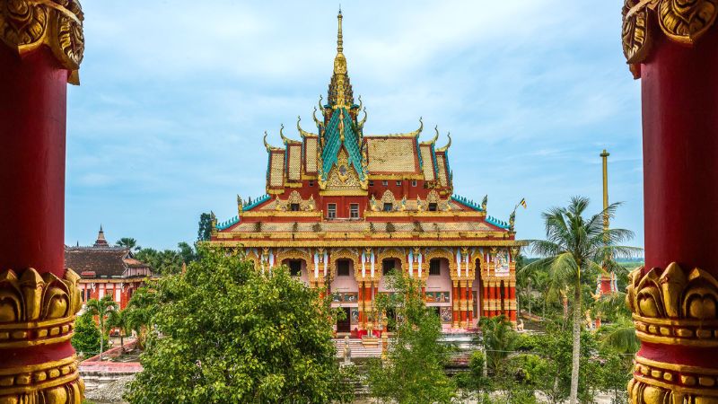 Chùa Ghositaram mang đậm nét kiến trúc của người Khmer, tạo cho du khách cảm giác như đang đặt chân vào một phiên bản thu nhỏ của Thái Lan. Điểm đến này nổi bật với màu sắc rực rỡ, với các tông màu đỏ vàng đặc trưng và là ngôi chùa Khmer lớn nhất tại Việt Nam.