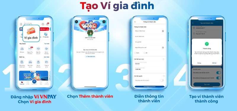 Để tạo Ví gia đình cho bố mẹ, con cái hoặc những người thân yêu, người dùng chọn tính năng Ví gia đình và tạo mới ví thành viên cho người thân trên ứng dụng. Sau đó, người thân đăng nhập vào ví VNPAY bằng số điện thoại vừa đăng ký để kích hoạt.
