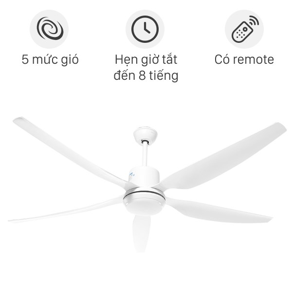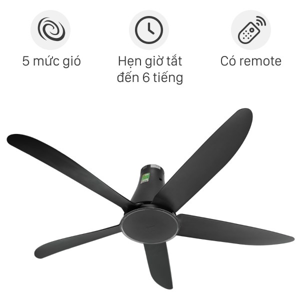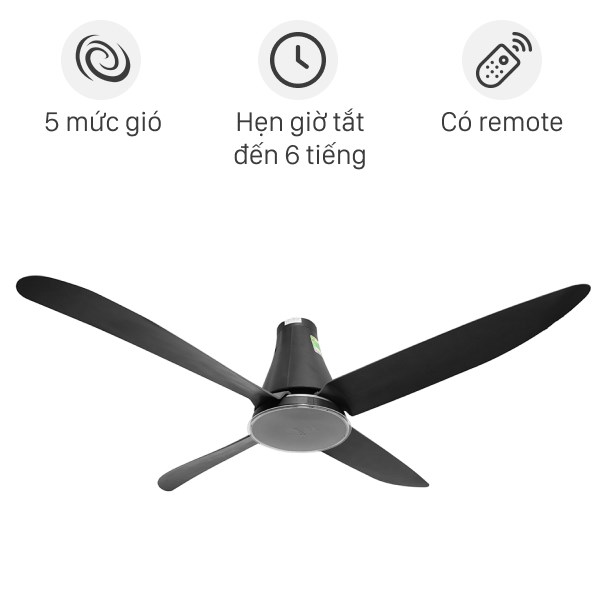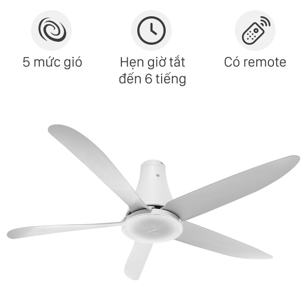 Quạt trần có 5 mức gió từ thấp giúp người dùng tùy chỉnh theo nhu cầu sử dụng. Điều khiển sản phẩm thông qua remote từ xa, hẹn giờ tắt quạt sau thời gian tương ứng 1 giờ, 3 giờ và 6 giờ giúp bạn chủ động thời gian sử dụng quạt.