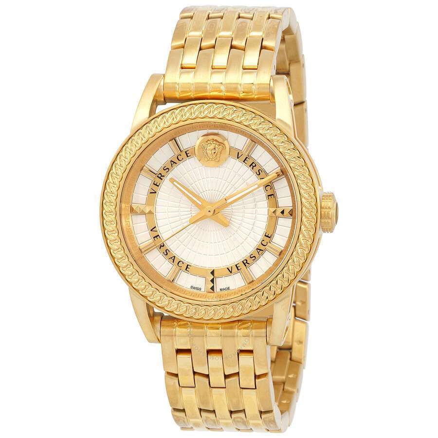 Gold IP stainless steel case and bracelet. Fixed gold IP stainless steel bezel. Silver dial with gold-tone hands and index hour markers. Dial Type: Analog. Luminescent hands and markers. Quartz movement. Scratch resistant sapphire crystal. Pull / push crown. Solid case back. Round case shape, case size: 41 mm. Butterfly clasp. Water resistant at 50 meters / 165 feet. Functions: hour, minute, second. Code Series. Casual watch style. Watch label: Swiss Made. Versace Code Quartz Silver Dial Men’s Watch VEPO00420.