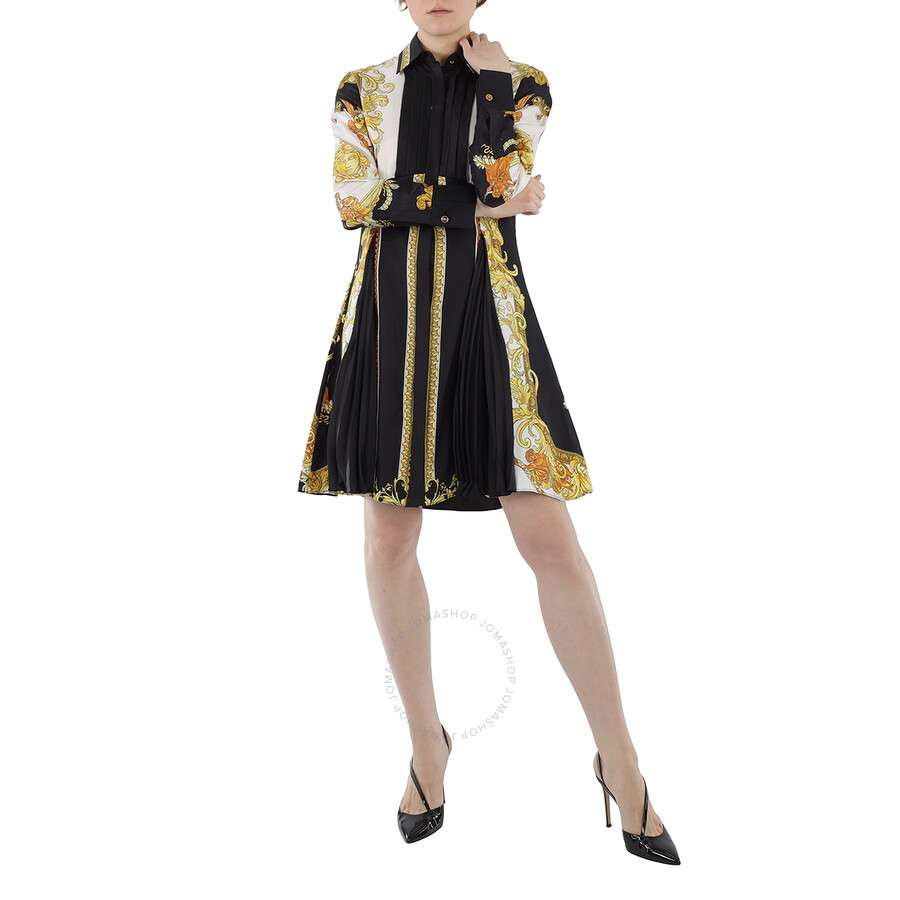 Versace Ladies Dresses. Fashion category: Casual Dresses. SKU: 1000933-1A01117-5B070. Color: Nero/Oro/Bianco. Versace Ladies Baroque Print Silk Shirt Dress. The Baroque print silk shirt dress features an allover baroque-pattern print, a relaxed fit, a classic collar, concealed front button opening, long cuffed sleeves, pleated inserts and A-line skirt. Silk 100% Made in Italy.