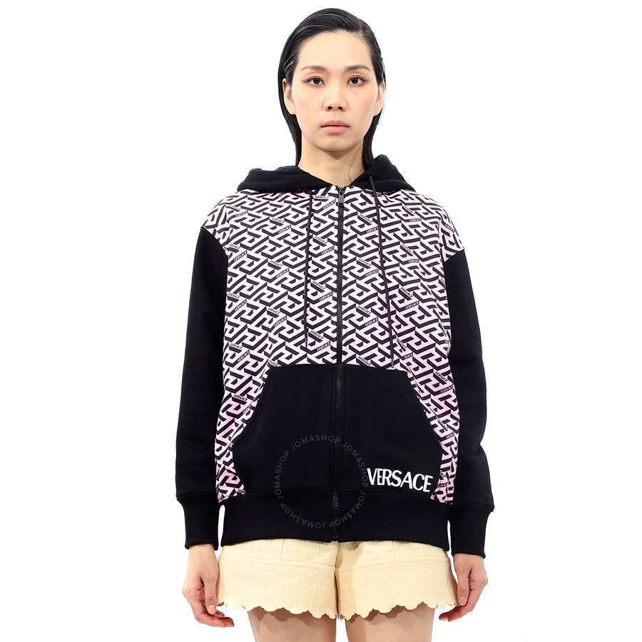 Versace Ladies Tops. Fashion category: Active & Lounge. SKU: 1004127-1A02983-5P210. Material: Cotton;Polyester. Material: Cotton;Polyester. Color: Candy/Black. Versace La Greca-print zip-fastening hoodie, This zip-fastening hoodie features the iconic monogram signature La Greca print in pink and black contrasting hues. Drawstring Hood. Front Zip Fastening. Long Sleeves. Front Pouch Pocket. Ribbed Trim. Made in Italy.