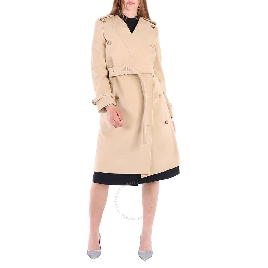 Burberry Ladies Outerwear. Fashion category: Coats & Jackets. SKU: 8046678. Color: Soft Fawn. Burberry Ladies Soft Fawn Wool Cashmere V-Neck Double-Breasted Trench Coat. This soft wool cashmere trench coat reimagined with a distinctive V-neck. The Italian-made piece is highlighted with animal-print fil coupe facing. It features a double-breasted closure, back button-through vent, long sleeves, belted cuffs, D-ring belt. Outer: 89% wool, 11% cashmere. Made in Italy.