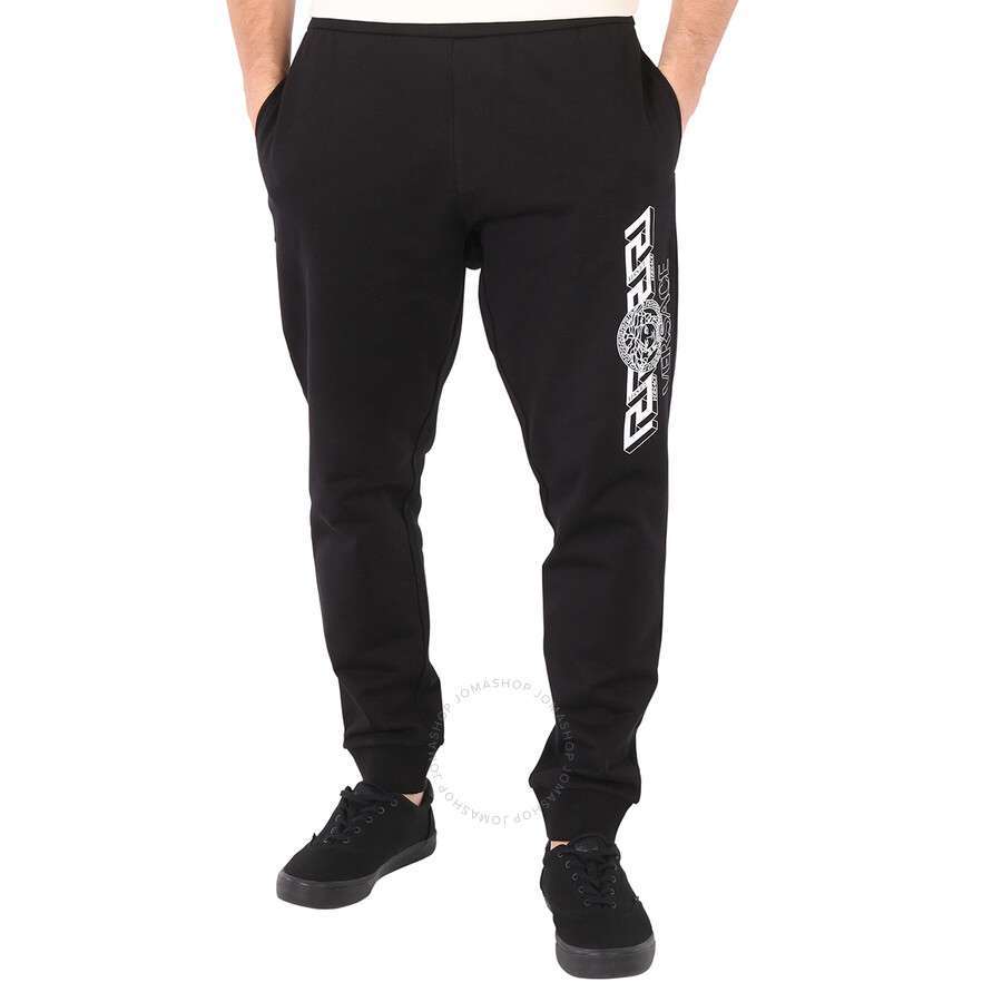 Versace Men’s Bottoms. Fashion category: Active & Lounge. SKU: 1004170 1A02861 1B000. Color: Black. Versace Men’s Black Greca Cotton Sweatpants. Crafted from soft cotton, these sweatpants feature an elasticated waistband, cuffed ankles, side pockets, and finished with Medusa Head motif and Greca detailing.