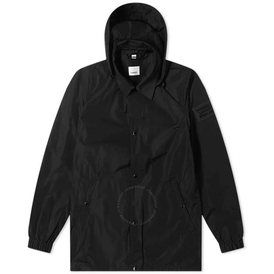 Burberry Men’s Outerwear. Fashion category: Coats & Jackets. SKU: 8014770. Color: Black. Burberry Men’s Black Lightweight Logo Detail Jacket In Black. This hooded lightweight jacket from Burberry features a hood, a front button fastening, long sleeves, two button pockets, an elasticated waistband and gathered cuffs. 100% Polyester.