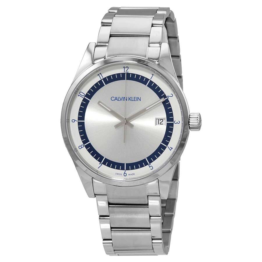 Stainless steel case with a stainless steel bracelet. Fixed stainless steel bezel. Silver dial with silver-tone hands and Arabic numeral / index hour markers. Minute markers around the outer rim. Dial Type: Analog. Luminescent hands and markers. Date display at the 3 o’clock position. Quartz movement. Scratch resistant sapphire crystal. Pull / push crown. Solid case back. Round case shape. Case size: 43 mm. Case thickness: 7.5 mm. Band width: 20 mm. Fold over clasp with a push button release. Water resistant at 50 meters / 165 feet. Functions: date, hour, minute, second. Dress watch style. Watch label: Swiss Made. Calvin Klein Quartz Silver Dial Men’s Watch KAM21146.