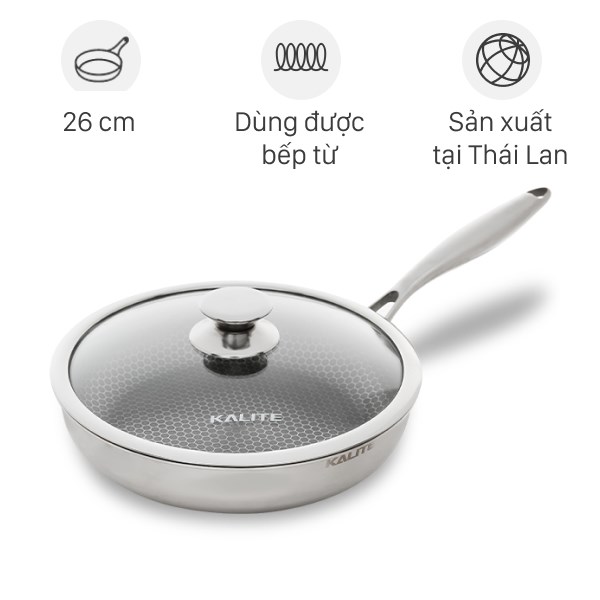 6Chảo inox sâu chống dính tổ ong đáy từ nắp kính 26 cm Kalite KL-326